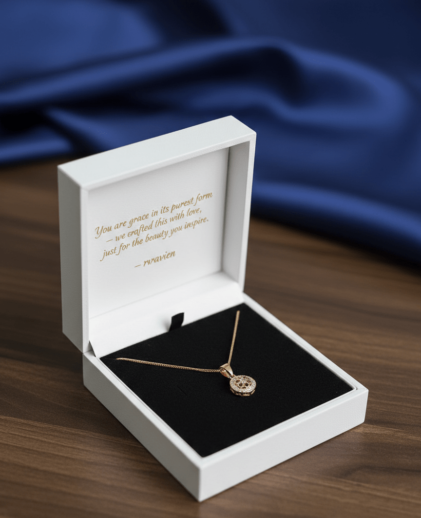 Preserve the brilliance of your RVRAVIEN pendant by storing it in a dry, airtight container when not in use. Avoid direct contact with water, perfumes, lotions, and harsh chemicals. After every wear, gently wipe the pendant and chain with a soft, dry cloth to maintain its lasting lustre and shine.
